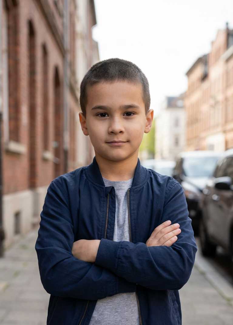 A young boy with a confident, friendly expression and a modern casual look, suitable for advertising children’s clothing, footwear, educational products, toys, family brands, and youth-focused campaigns.
